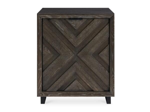 This stylish one-door cabinet features a dark charcoal oak veneer with a striking chevron wood grain pattern on the front.