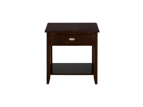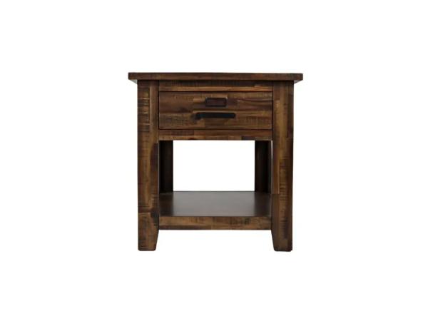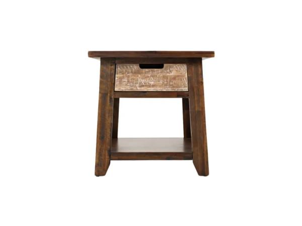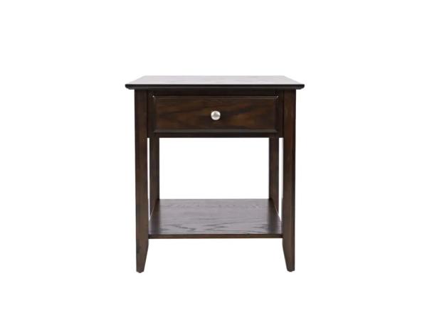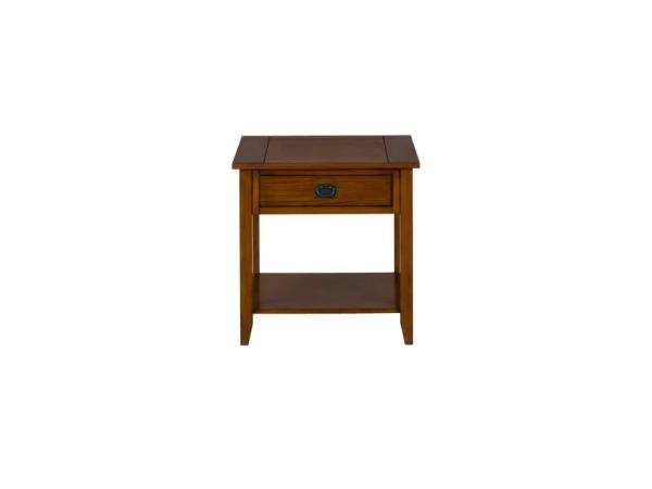 This Lake House end table, made from poplar solids and oak veneers with an oak finish, features a planked top and wood accents. It includes a bottom shelf and a drawer with antiqued brass hardware for storage.