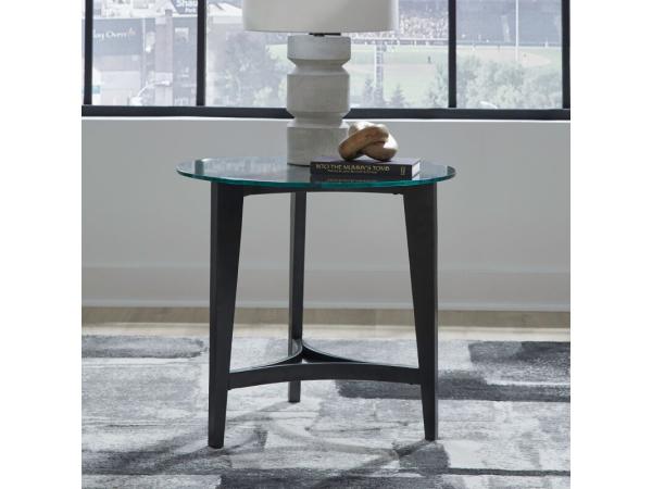 Round end table featuring a tempered glass top on a scooped triangle-shaped metal base in Espresso. Rubber bumper guards help keep the glass secure.