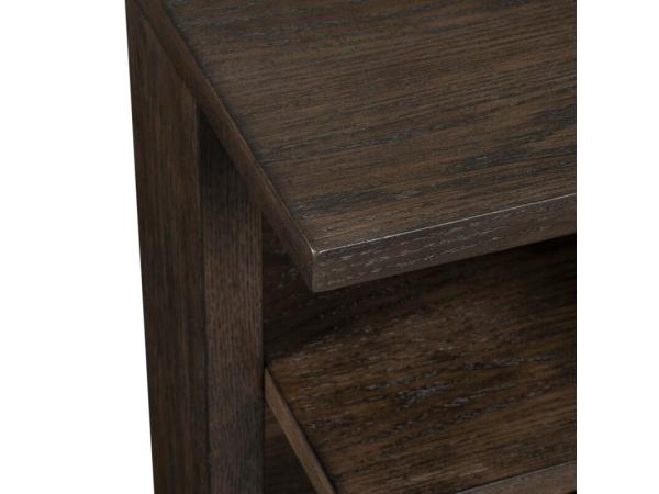 This elegant end table is crafted with Rubberwood solids and Oak veneers in a deep Espresso finish. Its thoughtful design features a layered top and a divided open bottom shelf for organized storage of essentials.