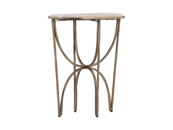 Our more feminine chairside table is crafted from cast iron and covered in an antique gold finish. Add a sweet