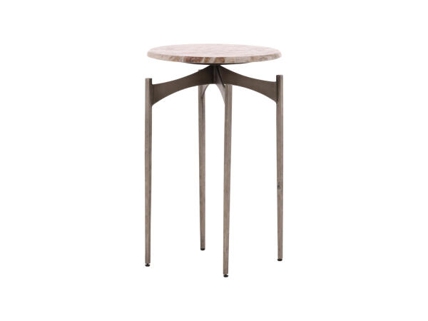 The Joanna Side Table exudes subtle elegance with its brushed silver iron base and softly veined marble top. Delicate hints