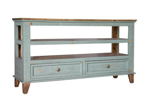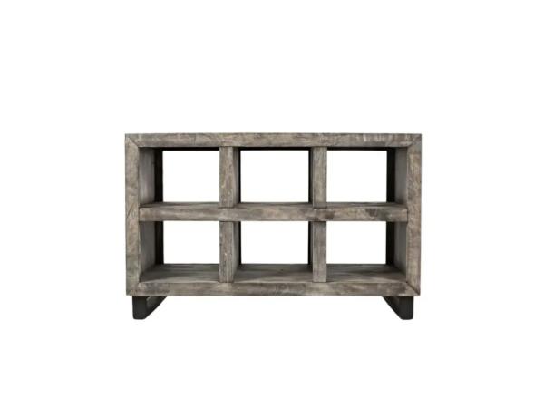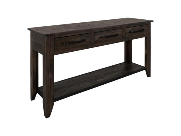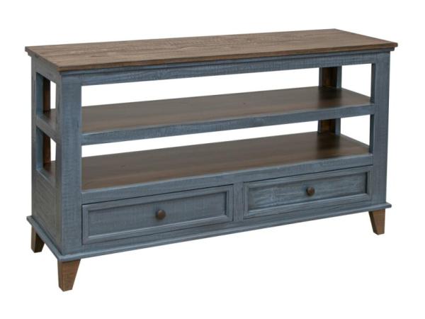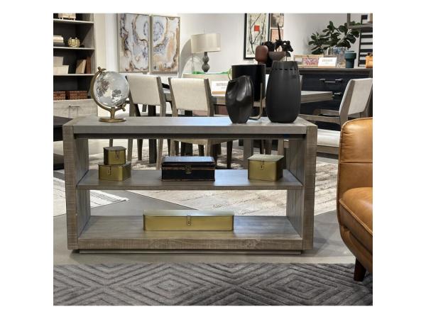 This contemporary Parkland Falls sofa table is crafted from pine solids and knotty pine veneers with a weathered taupe finish. It features two full extension drawers, four open shelves, two sliding doors with an adjustable shelf, and wire management provi