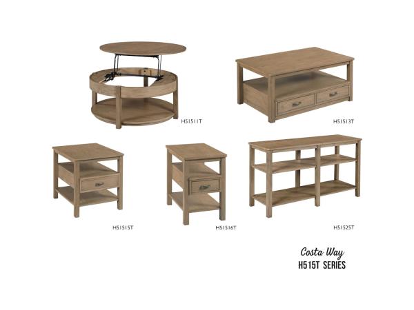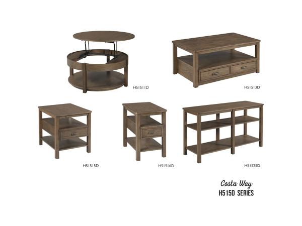 The Costa Way collection includes a lift top round cocktail table, rectangular cocktail table, rectangular end table, rectangular chairside table,