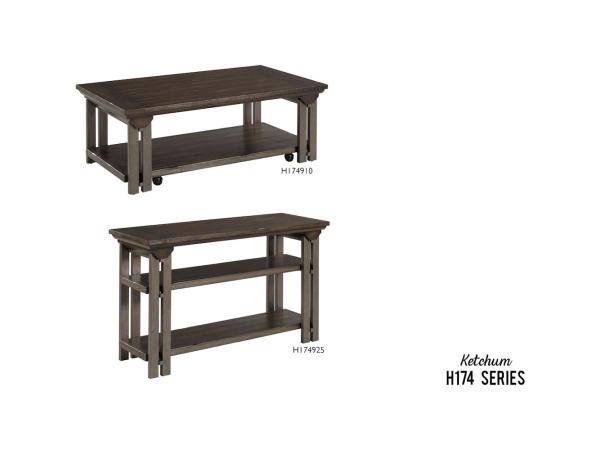 The Ketchum collection includes a rectangular cocktail table, rectangular end table, round chairside table, and sofa table. Product Details Material