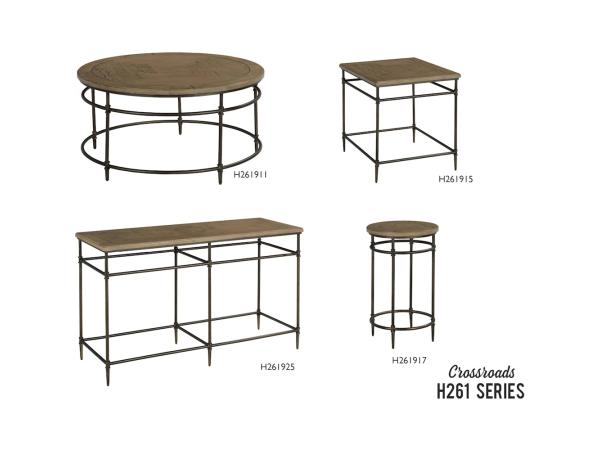 The Crossroads collection includes a round cocktail table, rectangular end table, rounc chairside table, and sofa table. Product Details Finish