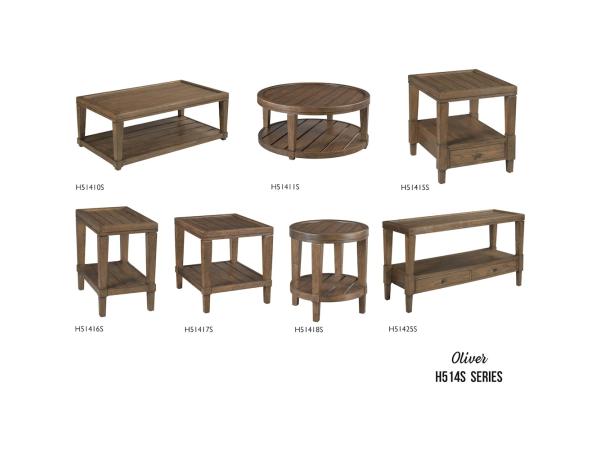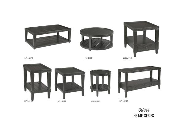 The Oliver collection includes a rectangular cocktail table, round cocktail table, rectangular end table, rectangular chairside table, round end table,