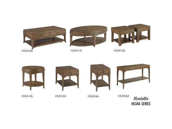 The Nicolette collection includes a rectangular cocktail table, oval cocktail table, bunching cocktail table, oval end table, rectangular end table,