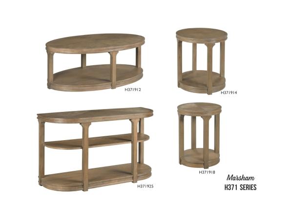 The Marsham collection includes an oval cocktail table, oval end table, round chairside table, and sofa table. Product Details Material