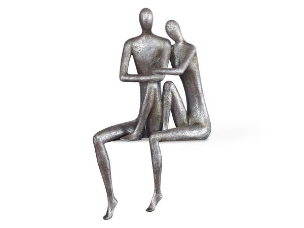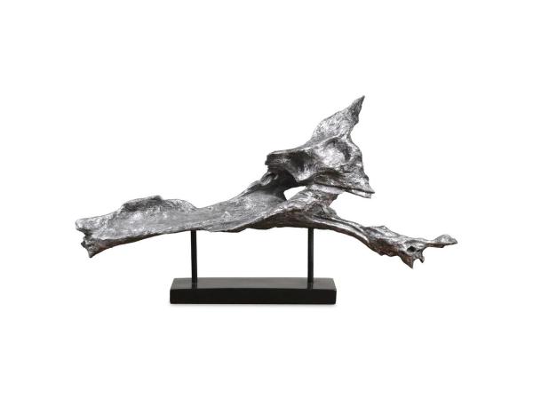 Textured figurines with an appearance of hand molding finished in a heavily aged silver displayed on a porous textured, aged
