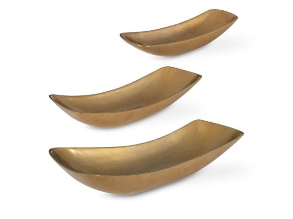 Set of three, textured cast aluminum bowls feature an antique brass finish. Sizes: S-13x3x4, M-16x4x6, L-20x4x8