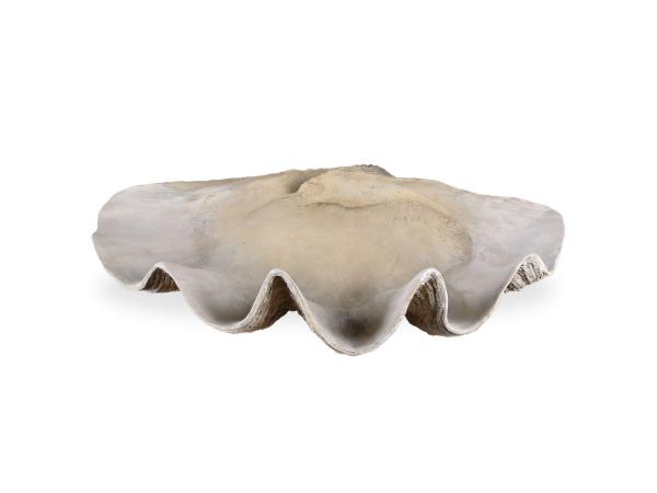 This decorative bowl is designed to closely mimic a clamshell with an antique white finish. A perfect statement piece for