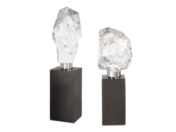 A stunning pair of modern sculptures featuring raw, faceted crystal formations atop sleek black bases with polished nickel accents. These
