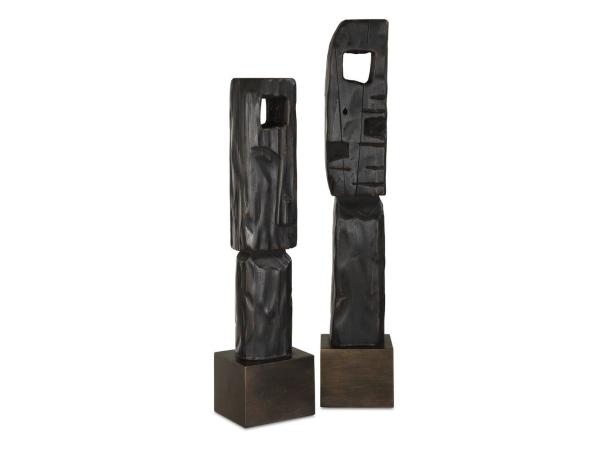 Elevate your space with this striking set of abstract wood sculptures. Featuring a bold, handcrafted design with aged black and