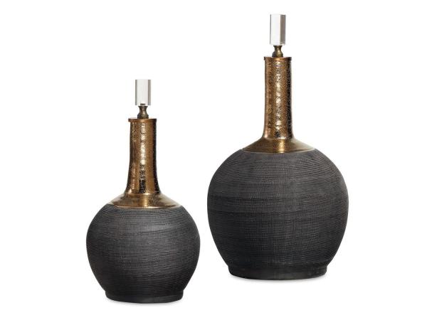 Ceramic bottles with matte black hand-scored bodies, golden metallic glazed necks and shaped crystal finials. Sizes: S-7x14x7, L-9x17x9