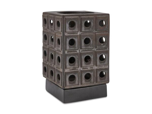 This sculptural earthenware candle holder features a unique design with a modern, architectural design, finished with a distressed brown glaze,