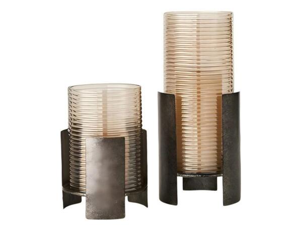 This elegant pair of candleholders feature removable ribbed glass cylinders that sit within a striking dark bronze cast iron stand.