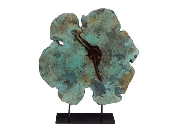 This striking sculpture, crafted from 100% natural tamarind wood, showcases a captivating blue-green finish that beautifully enhances its organic texture.