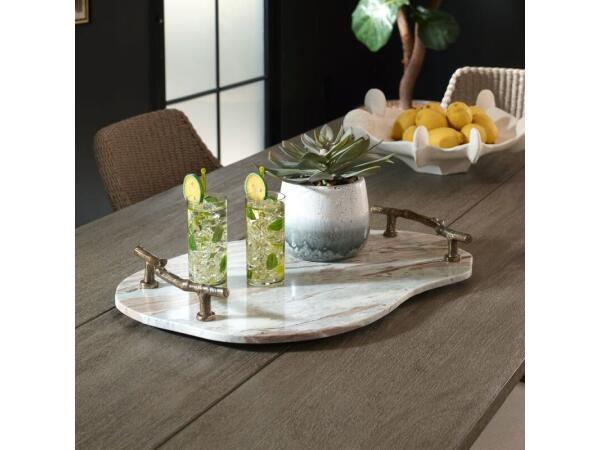 Crafted from natural marble, this tray has a unique, abstract shape with elegant gray, white, and rust-colored veining. The organic