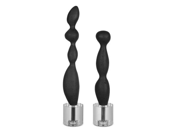 Set of two abstract sculptures made of black granulated marble set atop crystal bases. Sizes: S-4x16x4, L-4x20x4.