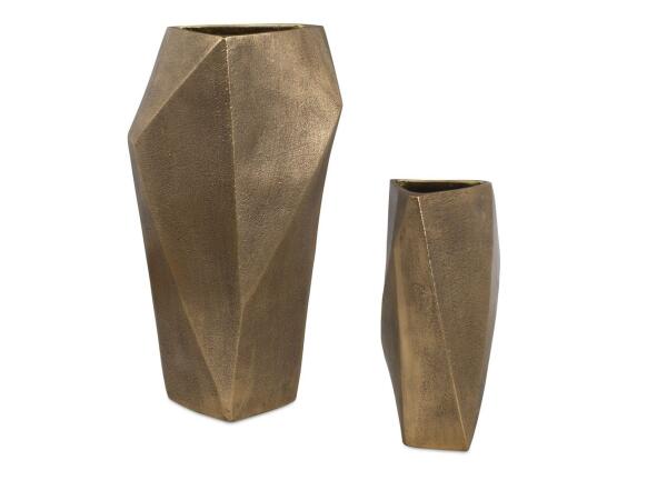 Cast aluminum set of vases feature a faceted, asymmetrical silhouette in an antique brass finish with dark bronze undertones. Safe