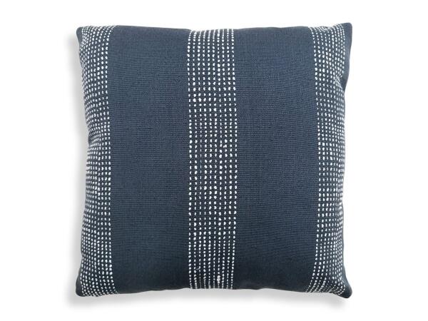 A slate blue ground contrasts against raised chenille stripes in Sunbrella solution dyed acrylic. Complete with an invisible zipper and
