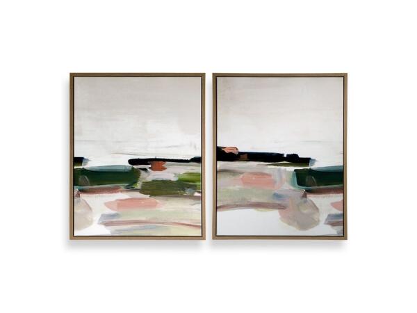 In this set of abstract landscapes, soft washes of salmon, mauve, green, and cream ground the artwork while allowing the