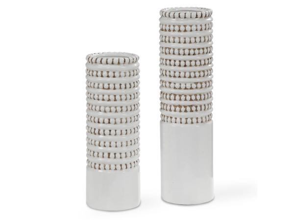 Set of two ceramic vases finished in a white glaze with taupe accents, beaded texture and a ribbed interior. Sizes: