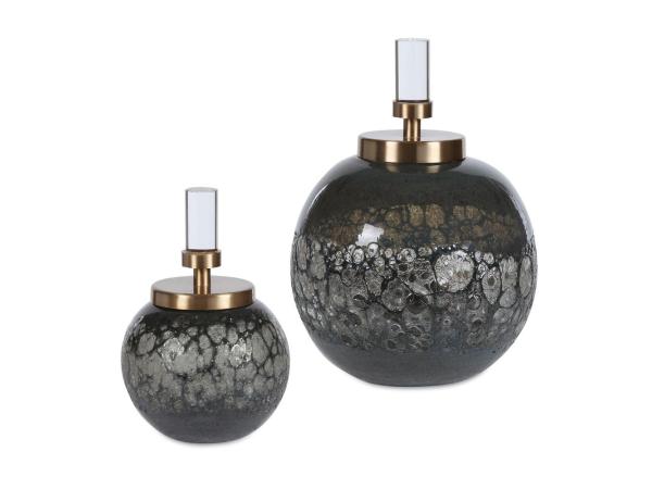 Set of two art glass bottles feature organic texture with an iridescent blue-gray hue. Each bottle is paired with a