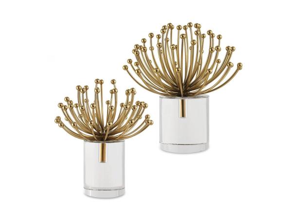 Displaying an elevated contemporary feel, these steel objects are finished in an elegant brushed gold atop large crystal bases. Sizes: