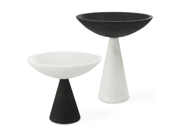 Set of two modern pedestal bowls are crafted from a striking black and white man-made stone that accurately replicating the