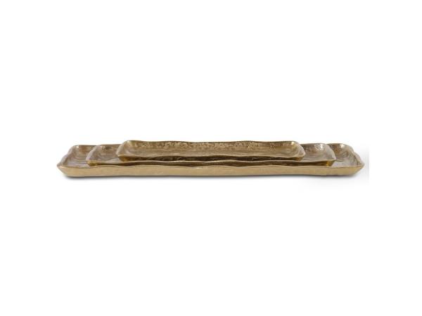 Set of three cast aluminum trays displays organic edges with a heavily textured light antique gold finish. Sizes: S-15x1x5, M-20x1x6,