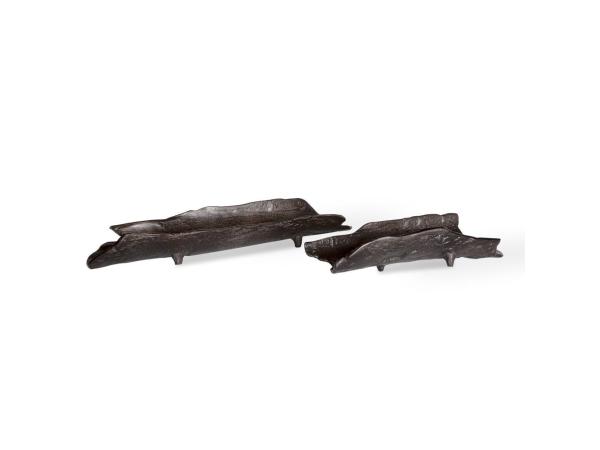These cast aluminum trays feature unique, organic shapes finished in dark black nickel. Sizes: S-13x3x6, L-21x3x6
