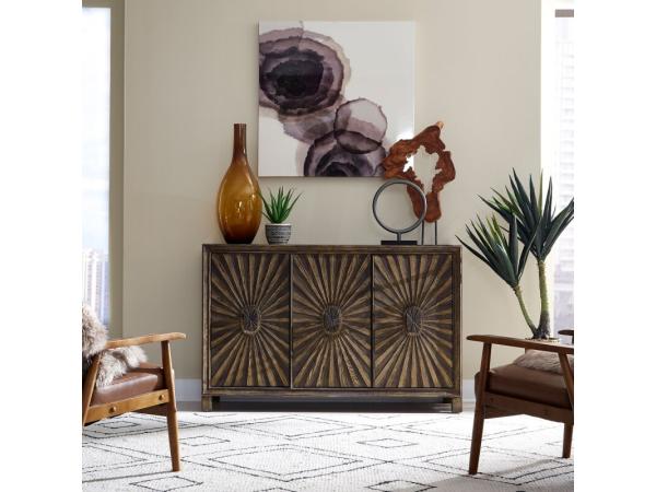 The Chaucer accent cabinet is crafted from rubberwood solids with Acacia/Ash veneer in an Aged Whiskey finish. It features three starburst design doors with 90-degree European hinges and custom starburst pull hardware, offering a unique storage solution.