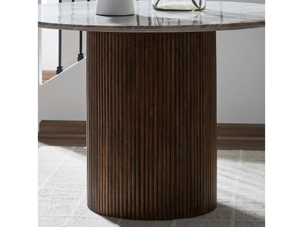 Crafted from Mango solids, this round pedestal table base features a cylindrical shape with reeded detailing for added texture. It is finished in a warm, Aged Whiskey hue and must be paired with a compatible tabletop.