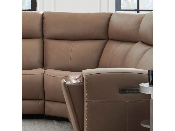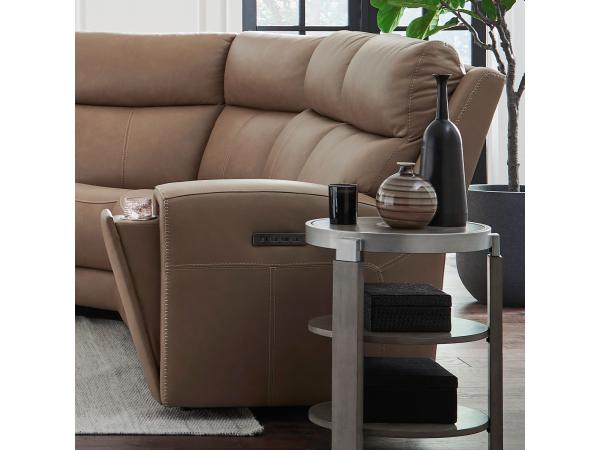 Add functionality to your sectional with this versatile console, featuring a deep interior storage compartment and multiple charging options. It includes AC, USB-A, USB-C, and wireless charging, plus pop-out stainless steel cupholders.