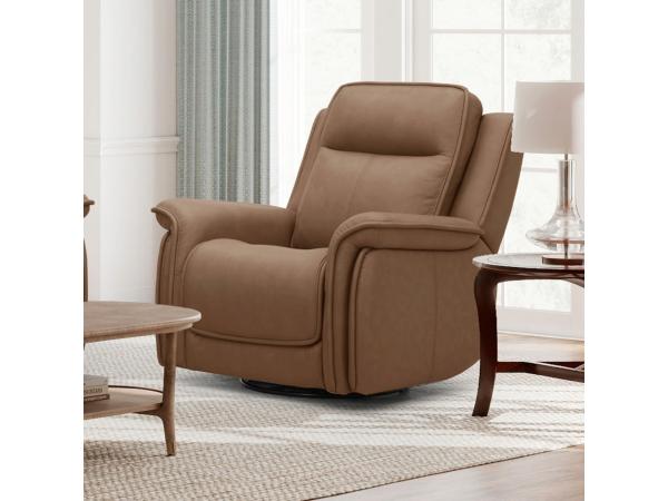 Relax in this transitional-modern swivel glide recliner with triple power functionality, including a power headrest and power lumbar support. It features contoured seating for comfort and a convenient side control panel with USB and USB-C charging ports.