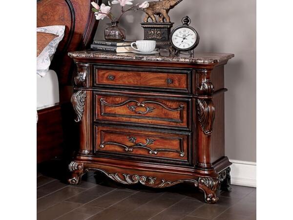 Handsome carvings and appealing details are found on this mirror. Finished in antique dark oak and paired with a matching