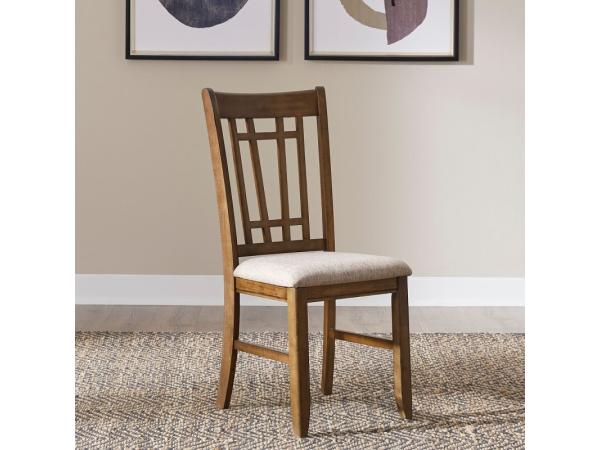 The Santa Rosa II lattice back side chair is crafted from rubberwood solids and oak veneers with an antique honey finish. It features a lattice wood back, a textured linen upholstered seat, tapered legs, and nylon glides.