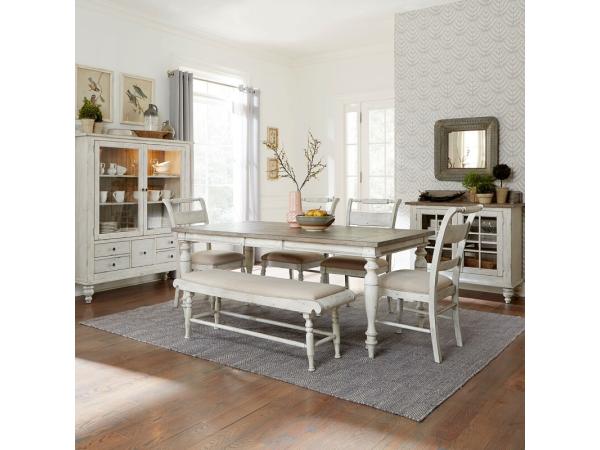 Crafted from rubberwood solids and oak veneers, the Whitney rectangular leg table features an antique linen and weathered gray finish for an English country charm. It includes a 14 inch leaf to accommodate guests and is anchored by heavily turned legs.