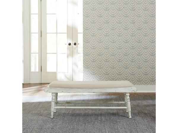 The Whitney bench, crafted from rubberwood solids, features linen upholstery and turned legs with an antique linen and weathered gray finish. Nylon glides protect flooring while adding English country charm.