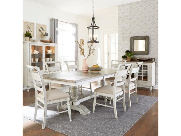 This Whitney trestle table base, crafted from rubberwood solids, features an antique linen finish with chipping and distressing. It boasts heavy round turned legs and a straight center trestle, adding English country charm.