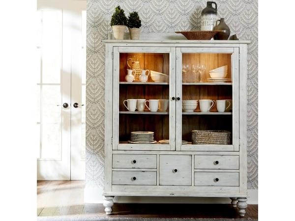 The Whitney server, crafted from rubberwood solids and oak veneers, features wood-framed glass doors with an adjustable shelf and a gallery top. Its antique linen and weathered gray finish with turned bun feet adds English country charm.