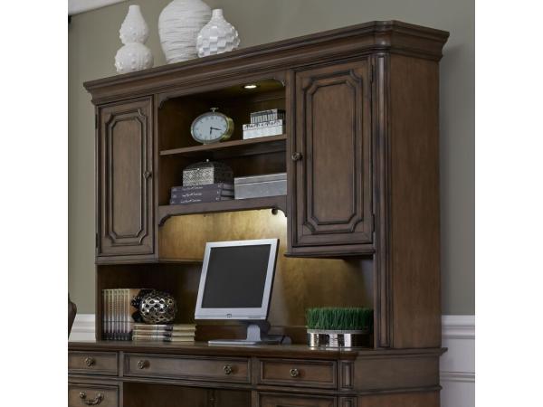 The Amelia Jr. Executive credenza hutch features doors with adjustable shelves, non-glare adjustable task lighting, and elegant crown molding. Constructed from poplar solids with birch veneers, it includes antique brass hardware and wire management.