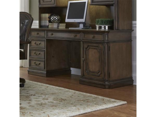 Crafted from poplar solids with birch veneers, this Amelia Jr. executive credenza top features a smooth antique toffee finish. It has chamfered corners with soft concave shaping and a fancy face veneer top with bead molding.