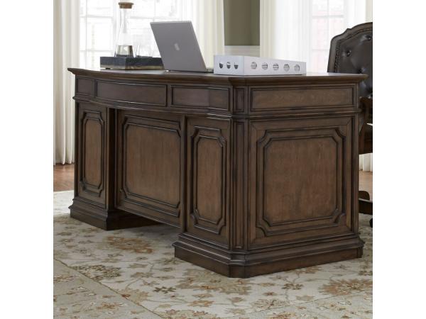 This Amelia Jr. executive desk base features seven full extension drawers, including two locking file drawers, and is crafted from poplar solids with birch veneers. It has an antique toffee finish, English dovetail construction, and wire management provis