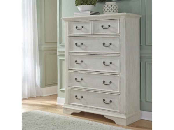 This Bayside 5-drawer chest is crafted from pine solids and acacia veneers with an antique white finish, featuring fully stained interior drawers and wood framed drawer fronts. It offers cottage styling with a vintage, shabby chic aesthetic.