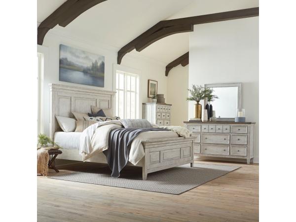 King Opt California Panel Bed, Dresser & Mirror, Chest