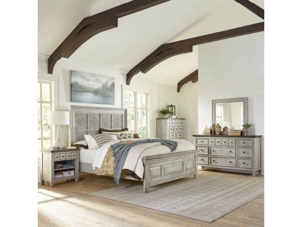 Heartland Opt Queen Panel Bed, Dresser & Mirror, Chest, Night Stand