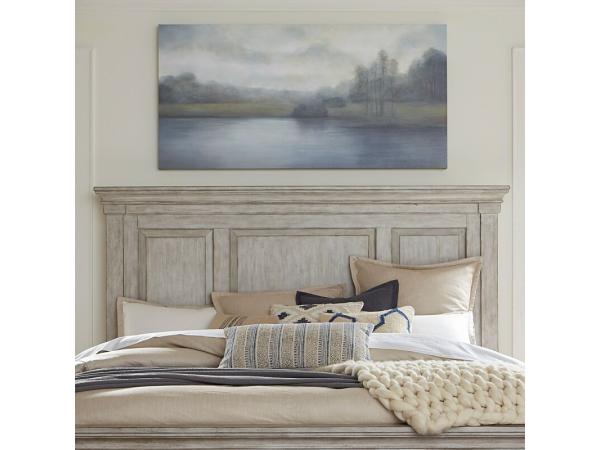 This Heartland King panel headboard features heavy top crown molding and raised panels, crafted from Rubberwood solids with Cathedral White Oak and Birch veneers. It has an Antique White finish with Tobacco Tops.